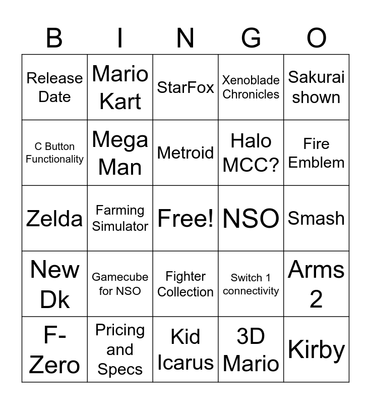 This bingo card has a free space and 24 words: Gamecube for NSO, Pricing and Specs, Metroid, F-Zero, Sakurai shown, Release Date, C Button Functionality, Mario Kart, NSO, Fighter Collection, Halo MCC?, Zelda, Switch 1 connectivity, Arms 2, Mega Man, 3D Mario, Smash, StarFox, Fire Emblem, Farming Simulator, Kirby, New Dk, Xenoblade Chronicles and Kid Icarus.