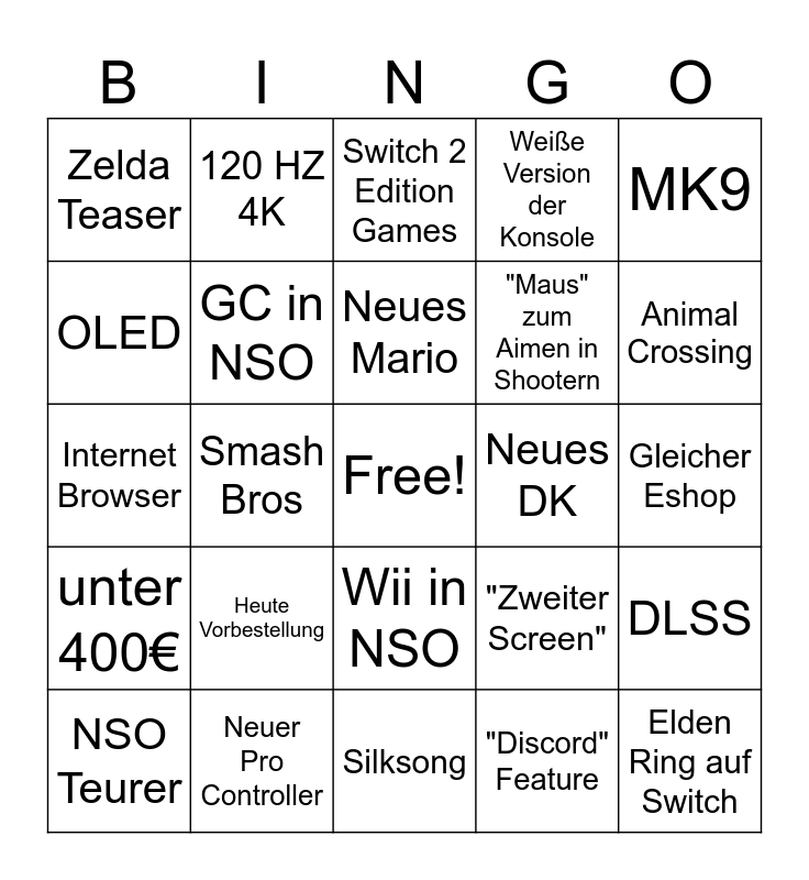 This bingo card has a free space and 24 words: NSO Teurer, Heute Vorbestellung, Neues Mario, "Discord" Feature, MK9, Zelda Teaser, 120 HZ 4K, Switch 2 Edition Games, Neues DK, Gleicher Eshop, Internet Browser, GC in NSO, "Zweiter Screen", DLSS, OLED, Neuer Pro Controller, Silksong, Weiße Version der Konsole, Animal Crossing, unter 400€, Smash Bros, Wii in NSO, "Maus" zum Aimen in Shootern and Elden Ring auf Switch.