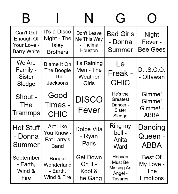 This bingo card has a free space and 30 words: Boogie Wonderland - Earth, Wind & Fire, Disco Inferno - The Trammps, Good Times - CHIC, And the Beat Goes On - The Whispers, Can't Get Enough Of Your Love - Barry White, Don't Leave Me This Way - Thelma Houston, Blame It On The Boogie - The Jacksons, Dolce Vita - Ryan Paris, He's the Greatest Dancer - Sister Sledge, Get Down On It - Kool & The Gang, Gimme! Gimme! Gimme! - ABBA, Best Of My Love - The Emotions, Heaven Must Be Missing An Angel - Tavares, Shake Your Booty - KC & The Sunshine Band, D.I.S.C.O. - Ottawan, You're the First, The Last, My Everything - Barry White, Ring my bell - Anita Ward, Hot Stuff - Donna Summer, Act Like You Know - Fat Larry's Band, Night Fever - Bee Gees, Shout - THe Trammps, Funky Town - Lipps Inc., It's a Disco Night - The Isley Brothers, Le Freak - CHIC, We Are Family - Sister Sledge, Bad Girls - Donna Summer, Dancing Queen - ABBA, September - Earth, Wind & Fire, It's Raining Men - The Weather Girls and I'm Coming Out - Diana Ross.