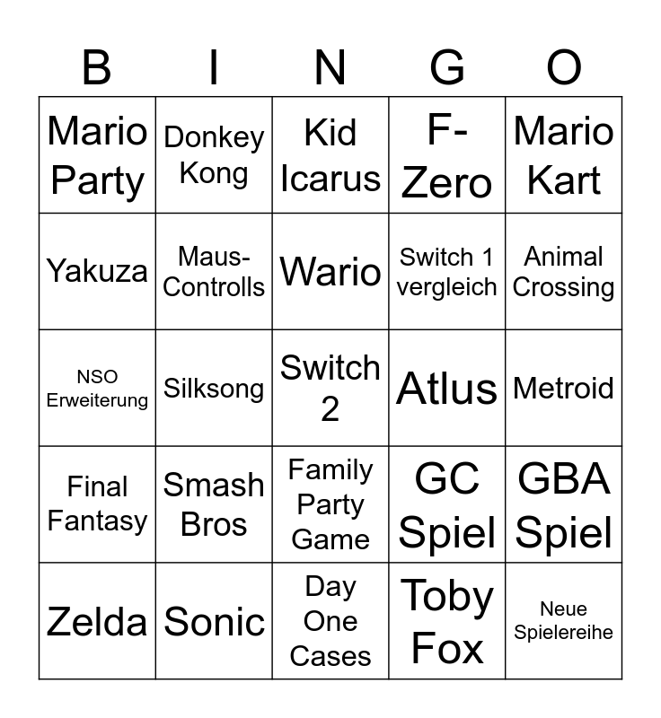This bingo card has a free space and 24 words: Smash Bros, Sonic, Wario, Zelda, Mario Kart, Mario Party, Yakuza, Donkey Kong, Atlus, Family Party Game, Switch 1 vergleich, NSO Erweiterung, GC Spiel, GBA Spiel, Maus-Controlls, Toby Fox, Metroid, Kid Icarus, Animal Crossing, Silksong, Neue Spielereihe, Final Fantasy, F-Zero and Day One Cases.