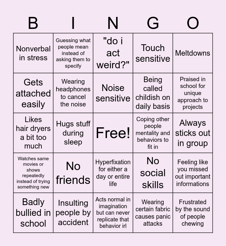 This bingo card has a free space and 24 words: Badly bullied in school, No friends, Noise sensitive, Wearing certain fabric causes panic attacks, Meltdowns, Nonverbal in stress, Guessing what people mean instead of asking them to specify, "do i act weird?", Coping other people mentality and behaviors to fit in, Always sticks out in group, Likes hair dryers a bit too much, Wearing headphones to cancel the noise, No social skills, Feeling like you missed out important informations, Gets attached easily, Insulting people by accident, Acts normal in imagination but can never replicate that behavior irl, Touch sensitive, Praised in school for unique approach to projects, Watches same movies or shows repeatedly instead of trying something new, Hugs stuff during sleep, Hyperfixation for either a day or entire life, Being called childish on daily basis and Frustrated by the sound of people chewing.