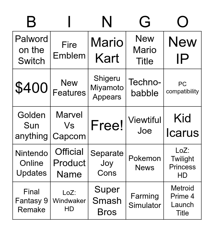 This bingo card has a free space and 24 words: Final Fantasy 9 Remake, Official Product Name, Shigeru Miyamoto Appears, Farming Simulator, New IP, Palword on the Switch, Fire Emblem, Mario Kart, Viewtiful Joe, Kid Icarus, Golden Sun anything, New Features, Pokemon News, LoZ: Twilight Princess HD, $400, LoZ: Windwaker HD, Super Smash Bros, New Mario Title, PC compatibility, Nintendo Online Updates, Marvel Vs Capcom, Separate Joy Cons, Techno-babble and Metroid Prime 4 Launch Title.
