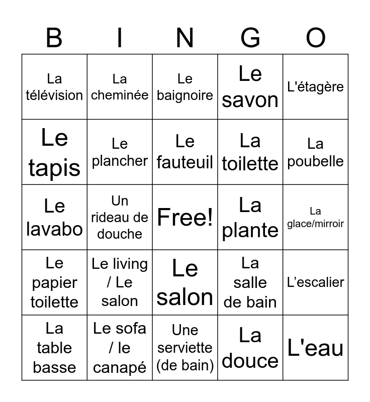 This bingo card has a free space and 24 words: Le living / Le salon, Le sofa / le canapé, Le fauteuil, La table basse, L'étagère, La télévision, Le tapis, La cheminée, La plante, Le salon, La toilette, Le lavabo, La salle de bain, L’escalier, Le plancher, La douce, La glace/mirroir, Le baignoire, La poubelle, Un rideau de douche, L'eau, Le papier toilette, Le savon and Une serviette (de bain).