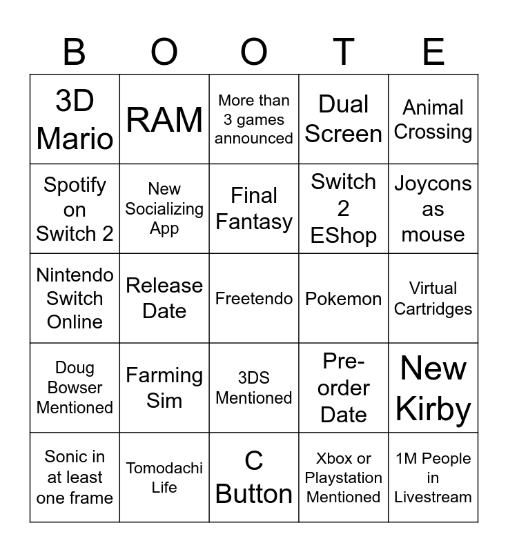 This bingo card has a free space and 24 words: Sonic in at least one frame, Farming Sim, Final Fantasy, Xbox or Playstation Mentioned, Animal Crossing, 3D Mario, RAM, More than 3 games announced, Pokemon, Virtual Cartridges, Nintendo Switch Online, New Socializing App, Pre-order Date, New Kirby, Spotify on Switch 2, Tomodachi Life, C Button, Dual Screen, Joycons as mouse, Doug Bowser Mentioned, Release Date, 3DS Mentioned, Switch 2 EShop and 1M People in Livestream.