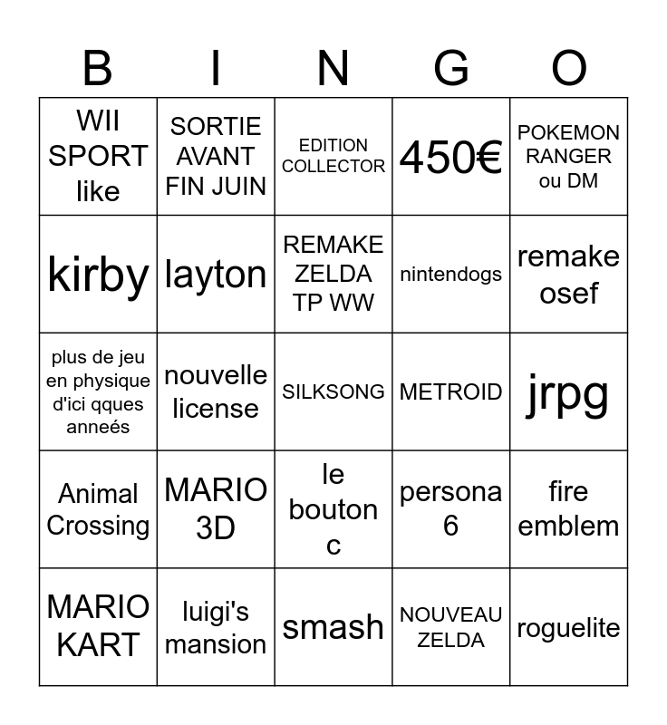 This bingo card has a free space and 24 words: MARIO KART, MARIO 3D, REMAKE ZELDA TP WW, NOUVEAU ZELDA, POKEMON RANGER ou DM, WII SPORT like, SORTIE AVANT FIN JUIN, EDITION COLLECTOR, METROID, jrpg, plus de jeu en physique d'ici qques anneés, layton, persona 6, fire emblem, kirby, luigi's mansion, smash, 450€, remake osef, Animal Crossing, nouvelle license, le bouton c, nintendogs and roguelite.