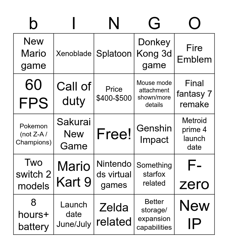 This bingo card has a free space and 24 words: Mario Kart 9, Launch date June/July, Price $400-$500, 8 hours+ battery, Fire Emblem, New Mario game, 60 FPS, Xenoblade, Genshin Impact, Nintendo ds virtual games, Mouse mode attachment shown/more details, Pokemon (not Z-A / Champions), Something starfox related, F-zero, Call of duty, Better storage/ expansion capabilities, Metroid prime 4 launch date, Splatoon, Final fantasy 7 remake, Sakurai New Game, New IP, Two switch 2 models, Donkey Kong 3d game and Zelda related.