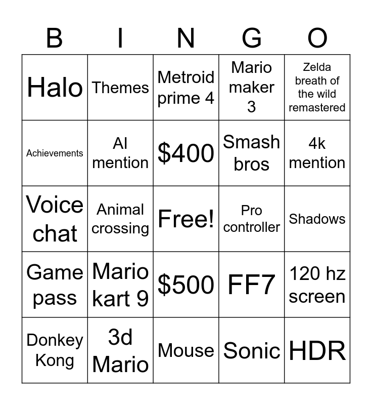 This bingo card has a free space and 24 words: Mario kart 9, 3d Mario, $400, Donkey Kong, Zelda breath of the wild remastered, Halo, Achievements, Themes, Pro controller, $500, Smash bros, Voice chat, FF7, 120 hz screen, AI mention, Sonic, Shadows, Metroid prime 4, 4k mention, Animal crossing, HDR, Game pass, Mario maker 3 and Mouse.