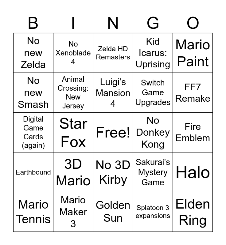 This bingo card has a free space and 24 words: 3D Mario, Mario Maker 3, Luigi’s Mansion 4, Mario Tennis, Mario Paint, No new Zelda, No new Smash, No Xenoblade 4, No Donkey Kong, No 3D Kirby, Switch Game Upgrades, Digital Game Cards (again), Sakurai’s Mystery Game, Halo, Animal Crossing: New Jersey, Splatoon 3 expansions, Fire Emblem, Zelda HD Remasters, FF7 Remake, Star Fox, Elden Ring, Earthbound, Kid Icarus: Uprising and Golden Sun.