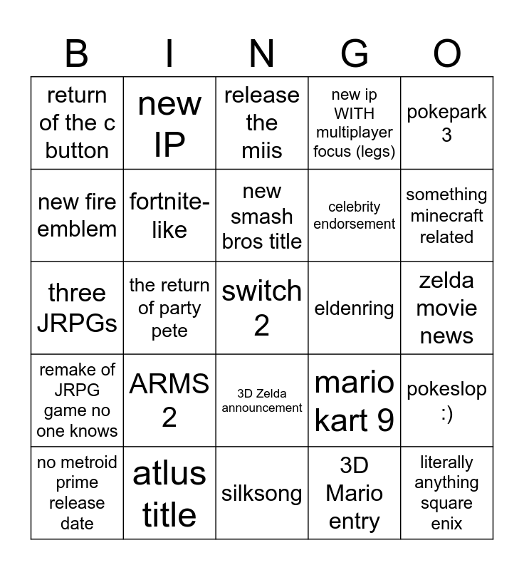 This bingo card has a free space and 24 words: ARMS 2, atlus title, new smash bros title, no metroid prime release date, pokepark 3, return of the c button, new fire emblem, new IP, eldenring, 3D Zelda announcement, celebrity endorsement, three JRPGs, mario kart 9, pokeslop :), fortnite-like, 3D Mario entry, zelda movie news, release the miis, something minecraft related, the return of party pete, literally anything square enix, remake of JRPG game no one knows, new ip WITH multiplayer focus (legs) and silksong.