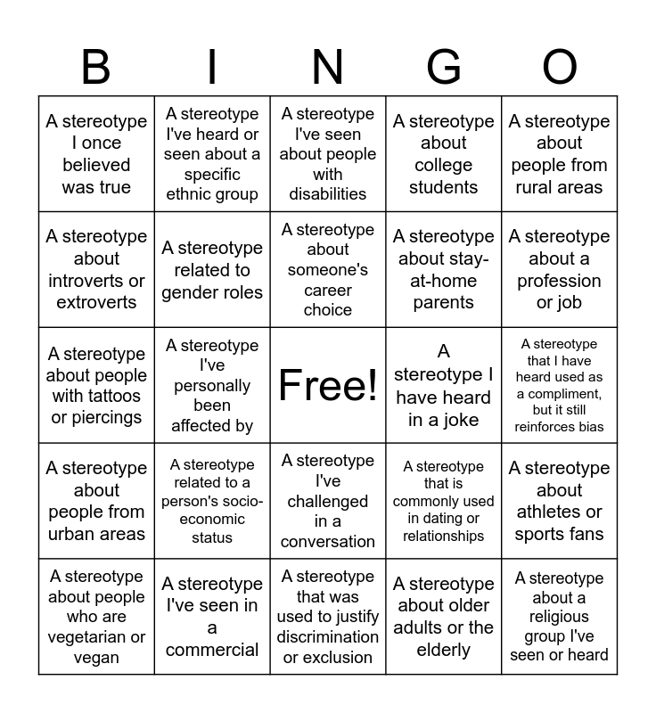 This bingo card has a free space and 30 words: A stereotype I've seen in a commercial, A stereotype I've heard in a history textbook, A stereotype I've personally been affected by, A stereotype portrayed in a movie I watched, A stereotype I once believed was true, A stereotype I've seen about people with disabilities, A stereotype related to gender roles, A stereotype I've challenged in a conversation, A stereotype I have heard in a joke, A stereotype that was used to justify discrimination or exclusion, A stereotype that I have heard used as a compliment, but it still reinforces bias, A stereotype about a religious group I've seen or heard, A stereotype about older adults or the elderly, A stereotype about a national identity or citizenship status, A stereotype about a profession or job, A stereotype that is linked to a specific type of food or cuisine, A stereotype that is commonly used in dating or relationships, A stereotype about people from urban areas, A stereotype related to a person's socio-economic status, A stereotype about people from rural areas, A stereotype about people with tattoos or piercings, A stereotype about people who are LGBTQIA+, A stereotype I've heard or seen about a specific ethnic group, A stereotype about stay-at-home parents, A stereotype about introverts or extroverts, A stereotype about college students, A stereotype about athletes or sports fans, A stereotype about people who are vegetarian or vegan, A stereotype about someone's career choice and A stereotype about unhoused people.