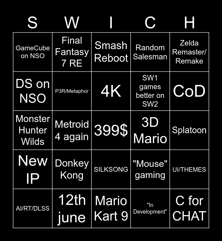 This bingo card has 25 words: Donkey Kong, Mario Kart 9, 4K, AI/RT/DLSS, Zelda Remaster/ Remake, GameCube on NSO, DS on NSO, Final Fantasy 7 RE, 3D Mario, SILKSONG, SW1 games better on SW2, Monster Hunter Wilds, "Mouse" gaming, UI/THEMES, P3R/Metaphor, C for CHAT, Splatoon, Smash Reboot, CoD, Metroid 4 again, 399$, 12th june, New IP, Random Salesman and "In Development".