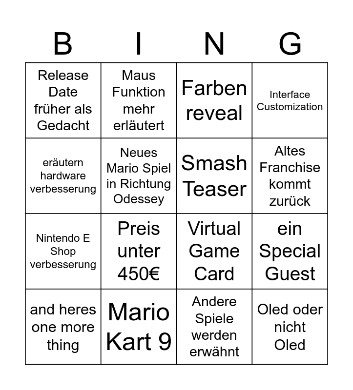 This bingo card has 16 words: Mario Kart 9, ein Special Guest, Farben reveal, Release Date früher als Gedacht, Nintendo E Shop verbesserung, Maus Funktion mehr erläutert, Virtual Game Card, Andere Spiele werden erwähnt, eräutern hardware verbesserung, Neues Mario Spiel in Richtung Odessey, and heres one more thing, Interface Customization, Preis unter 450€, Altes Franchise kommt zurück, Smash Teaser and Oled oder nicht Oled.