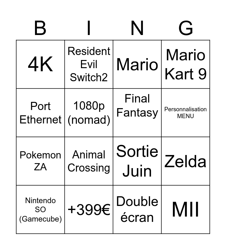 This bingo card has 16 words: +399€, Zelda, Mario, 4K, Pokemon ZA, Resident Evil Switch2, Sortie Juin, Double écran, Port Ethernet, 1080p (nomad), Nintendo SO (Gamecube), Mario Kart 9, Animal Crossing, Personnalisation MENU, Final Fantasy and MII.