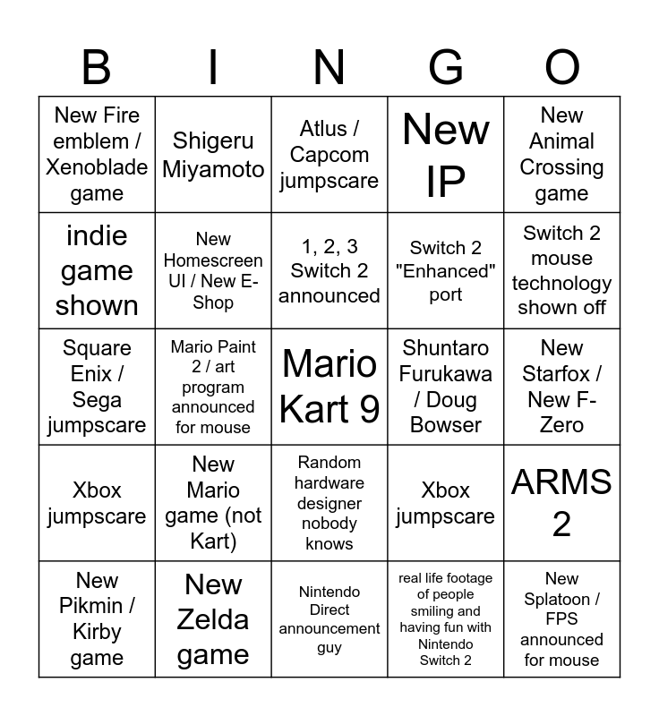 This bingo card has a free space and 24 words: New Mario game (not Kart), New Zelda game, 1, 2, 3 Switch 2 announced, New Pikmin / Kirby game, New Animal Crossing game, New Fire emblem / Xenoblade game, indie game shown, Shigeru Miyamoto, Shuntaro Furukawa / Doug Bowser, Random hardware designer nobody knows, Switch 2 "Enhanced" port, Square Enix / Sega jumpscare, Xbox jumpscare, ARMS 2, New Homescreen UI / New E-Shop, real life footage of people smiling and having fun with Nintendo Switch 2, New Starfox / New F-Zero, Atlus / Capcom jumpscare, Switch 2 mouse technology shown off, Mario Paint 2 / art program announced for mouse, New Splatoon / FPS announced for mouse, Xbox jumpscare, New IP and Nintendo Direct announcement guy.