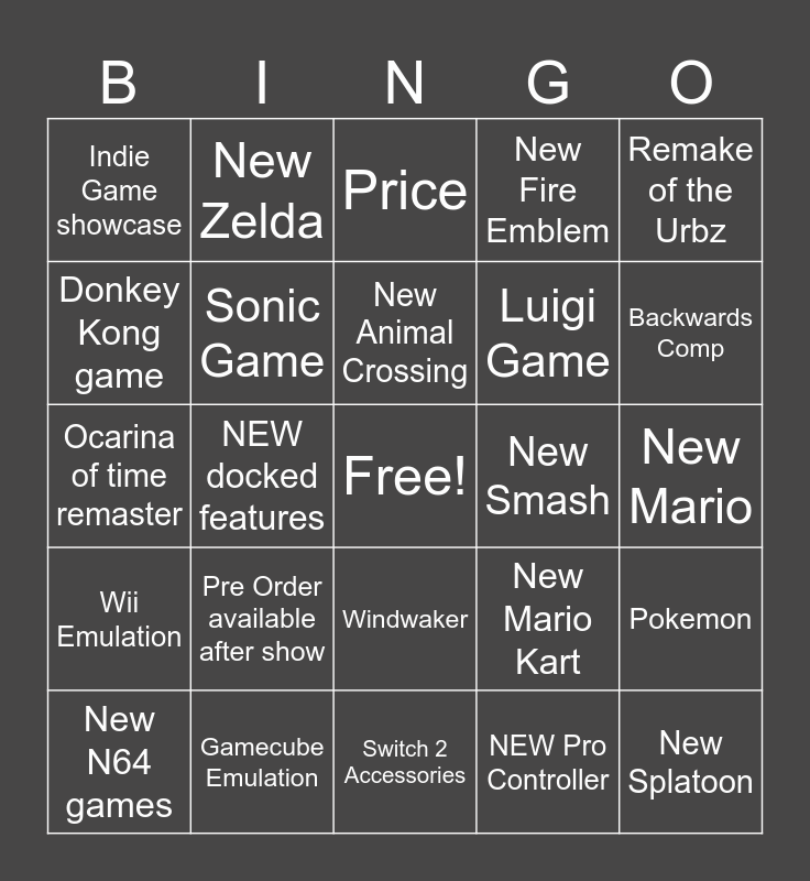 This bingo card has a free space and 24 words: Pre Order available after show, Gamecube Emulation, New Animal Crossing, New N64 games, Remake of the Urbz, Indie Game showcase, Donkey Kong game, New Zelda, New Smash, Windwaker, Luigi Game, Ocarina of time remaster, New Mario Kart, Pokemon, Sonic Game, NEW Pro Controller, New Mario, Price, Backwards Comp, NEW docked features, New Splatoon, Wii Emulation, New Fire Emblem and Switch 2 Accessories.