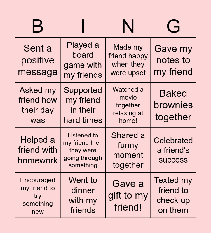 This bingo card has 16 words: Went to dinner with my friends, Celebrated a friend's success, Made my friend happy when they were upset, Sent a positive message, Helped a friend with homework, Played a board game with my friends, Shared a funny moment together, Gave a gift to my friend!, Asked my friend how their day was, Supported my friend in their hard times, Encouraged my friend to try something new, Gave my notes to my friend, Listened to my friend then they were going through something, Baked brownies together, Watched a movie together relaxing at home! and Texted my friend to check up on them.
