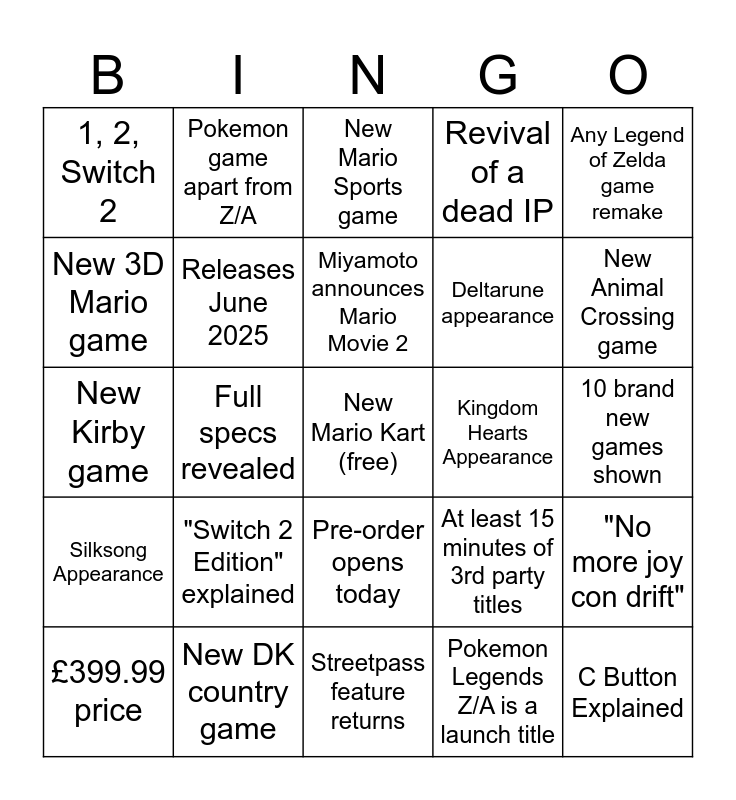 This bingo card has a free space and 24 words: "Switch 2 Edition" explained, New DK country game, Miyamoto announces Mario Movie 2, £399.99 price, Any Legend of Zelda game remake, 1, 2, Switch 2, New 3D Mario game, Pokemon game apart from Z/A, Kingdom Hearts Appearance, Pre-order opens today, Deltarune appearance, New Kirby game, At least 15 minutes of 3rd party titles, "No more joy con drift", Releases June 2025, Pokemon Legends Z/A is a launch title, 10 brand new games shown, New Mario Sports game, New Animal Crossing game, Full specs revealed, C Button Explained, Silksong Appearance, Revival of a dead IP and Streetpass feature returns.