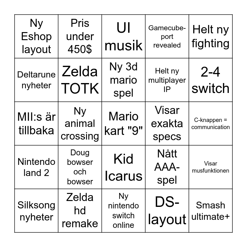 This bingo card has a free space and 24 words: Doug bowser och bowser, Zelda hd remake, Ny 3d mario spel, Silksong nyheter, Helt ny fighting, Ny Eshop layout, Deltarune nyheter, Pris under 450$, Visar exakta specs, Kid Icarus, Helt ny multiplayer IP, MII:s är tillbaka, Nått AAA-spel, Visar musfunktionen, Zelda TOTK, DS-layout, C-knappen = communication, UI musik, 2-4 switch, Ny animal crossing, Smash ultimate+, Nintendo land 2, Gamecube-port revealed and Ny nintendo switch online.