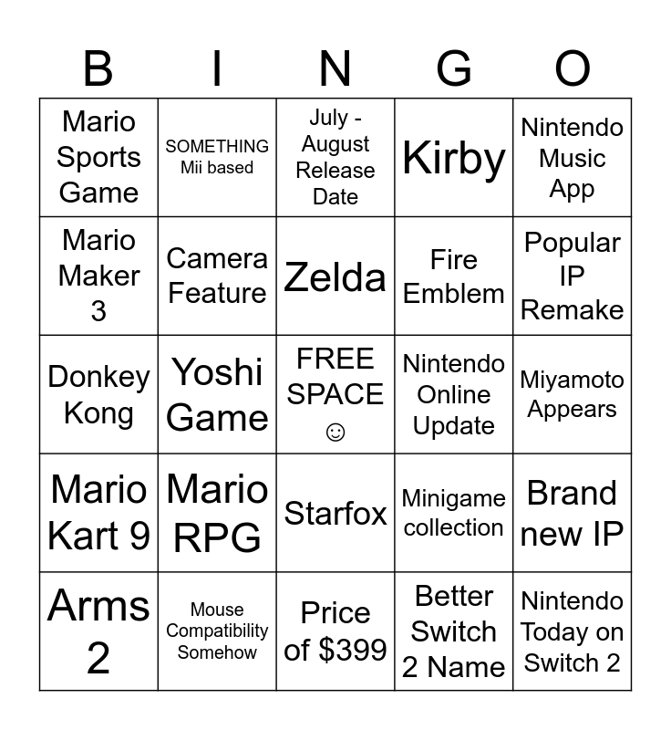 This bingo card has a free space and 24 words: Mario RPG, Mouse Compatibility Somehow, Zelda, Arms 2, Nintendo Music App, Mario Sports Game, Mario Maker 3, SOMETHING Mii based, Nintendo Online Update, Starfox, Fire Emblem, Donkey Kong, Minigame collection, Brand new IP, Camera Feature, Better Switch 2 Name, Miyamoto Appears, July - August Release Date, Popular IP Remake, Yoshi Game, Nintendo Today on Switch 2, Mario Kart 9, Kirby and Price of $399.