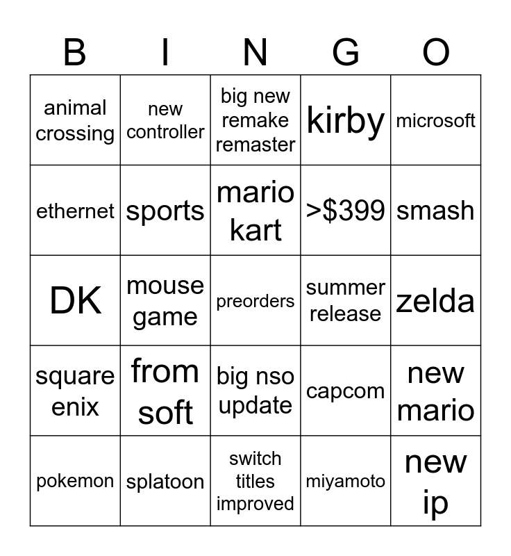This bingo card has a free space and 24 words: from soft, splatoon, mario kart, pokemon, microsoft, animal crossing, ethernet, new controller, summer release, big nso update, >$399, DK, capcom, new mario, sports, miyamoto, zelda, big new remake remaster, smash, mouse game, new ip, square enix, kirby and switch titles improved.