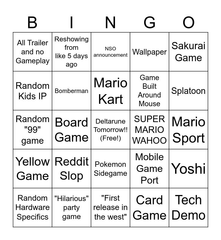 This bingo card has a free space and 24 words: Reddit Slop, "Hilarious" party game, Mario Kart, Random Hardware Specifics, Sakurai Game, All Trailer and no Gameplay, Random Kids IP, Reshowing from like 5 days ago, SUPER MARIO WAHOO, Pokemon Sidegame, Game Built Around Mouse, Random "99" game, Mobile Game Port, Yoshi, Bomberman, Card Game, Mario Sport, NSO announcement, Splatoon, Board Game, Tech Demo, Yellow Game, Wallpaper and "First release in the west".