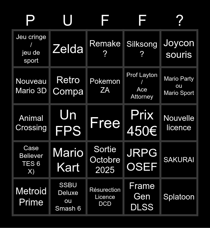 This bingo card has a free space and 24 words: Mario Kart, SSBU Deluxe ou Smash 6, Pokemon ZA, Metroid Prime, Joycon souris, Jeu cringe / jeu de sport, Nouveau Mario 3D, Zelda, Prix 450€, Sortie Octobre 2025, Prof Layton / Ace Attorney, Animal Crossing, JRPG OSEF, SAKURAI, Retro Compa, Frame Gen DLSS, Nouvelle licence, Remake ?, Mario Party ou Mario Sport, Un FPS, Splatoon, Case Believer TES 6 X), Silksong ? and Résurection Licence DCD.