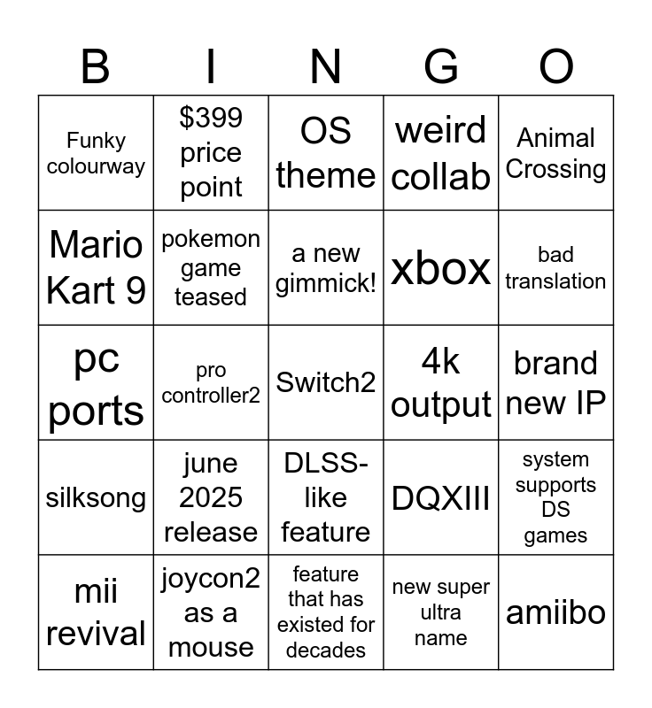 This bingo card has a free space and 24 words: june 2025 release, joycon2 as a mouse, a new gimmick!, mii revival, Animal Crossing, Funky colourway, Mario Kart 9, $399 price point, 4k output, DLSS-like feature, xbox, pc ports, DQXIII, system supports DS games, pokemon game teased, new super ultra name, brand new IP, OS theme, bad translation, pro controller2, amiibo, silksong, weird collab and feature that has existed for decades.