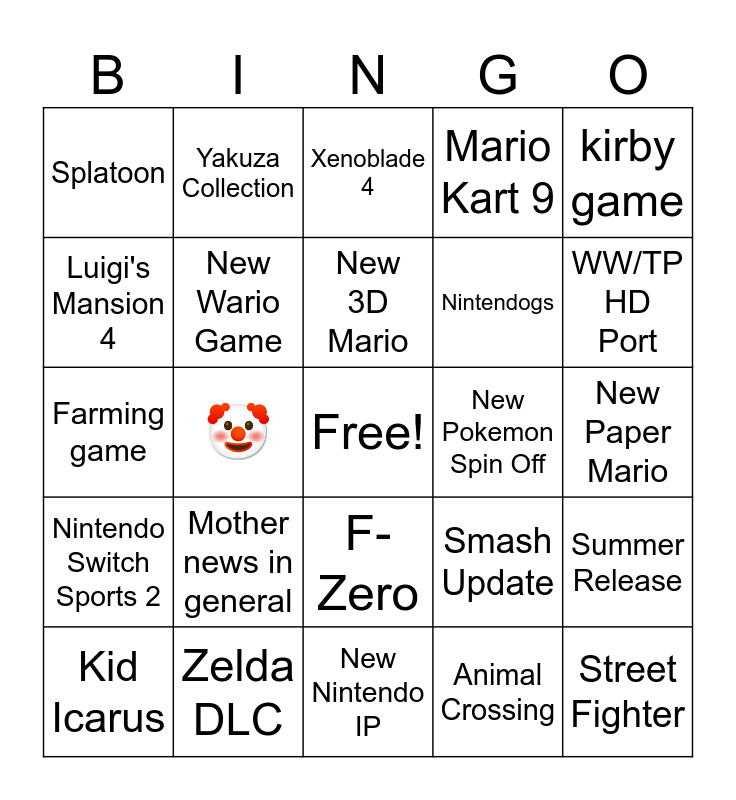 This bingo card has a free space and 24 words: Mother news in general, Zelda DLC, New 3D Mario, Kid Icarus, kirby game, Splatoon, Luigi's Mansion 4, Yakuza Collection, New Pokemon Spin Off, F-Zero, Nintendogs, Farming game, Smash Update, Summer Release, New Wario Game, Animal Crossing, New Paper Mario, Xenoblade 4, WW/TP HD Port, 🤡, Street Fighter, Nintendo Switch Sports 2, Mario Kart 9 and New Nintendo IP.