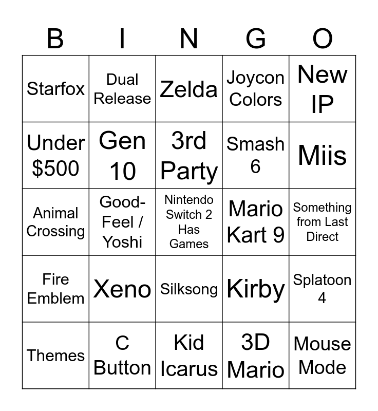 This bingo card has a free space and 24 words: Xeno, C Button, 3rd Party, Themes, New IP, Starfox, Under $500, Dual Release, Mario Kart 9, Silksong, Smash 6, Animal Crossing, Kirby, Splatoon 4, Gen 10, 3D Mario, Something from Last Direct, Zelda, Miis, Good-Feel / Yoshi, Mouse Mode, Fire Emblem, Joycon Colors and Kid Icarus.