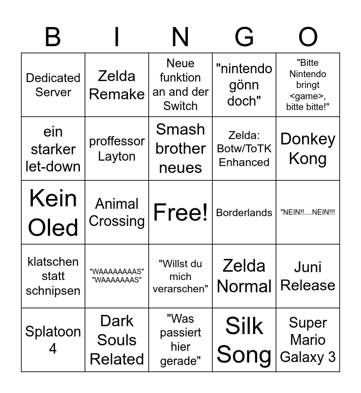 This bingo card has a free space and 24 words: "WAAAAAAAAS" "WAAAAAAAS", Dark Souls Related, Smash brother neues, Splatoon 4, "Bitte Nintendo bringt <game>, bitte bitte!", Dedicated Server, ein starker let-down, Zelda Remake, Borderlands, "Willst du mich verarschen", Zelda: Botw/ToTK Enhanced, Kein Oled, Zelda Normal, Juni Release, proffessor Layton, Silk Song, "NEIN!!....NEIN!!!, Neue funktion an and der Switch, Donkey Kong, Animal Crossing, Super Mario Galaxy 3, klatschen statt schnipsen, "nintendo gönn doch" and "Was passiert hier gerade".
