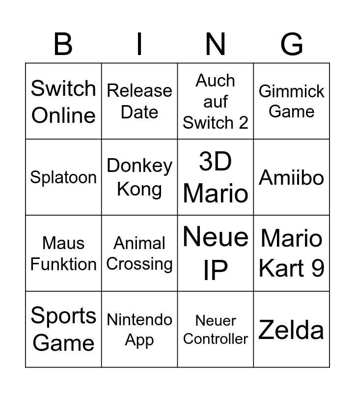 This bingo card has 16 words: Nintendo App, Mario Kart 9, Auch auf Switch 2, Switch Online, Maus Funktion, Release Date, Neue IP, Neuer Controller, Splatoon, Donkey Kong, Sports Game, Gimmick Game, Animal Crossing, Amiibo, 3D Mario and Zelda.