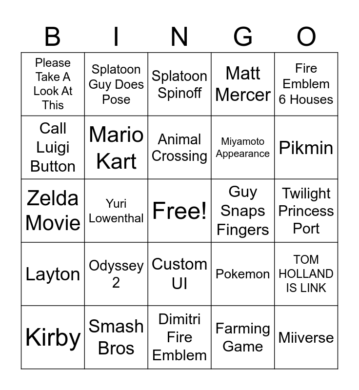 This bingo card has a free space and 24 words: Odyssey 2, Smash Bros, Animal Crossing, Kirby, Fire Emblem 6 Houses, Please Take A Look At This, Call Luigi Button, Splatoon Guy Does Pose, Guy Snaps Fingers, Custom UI, Miyamoto Appearance, Zelda Movie, Pokemon, TOM HOLLAND IS LINK, Mario Kart, Farming Game, Twilight Princess Port, Splatoon Spinoff, Pikmin, Yuri Lowenthal, Miiverse, Layton, Matt Mercer and Dimitri Fire Emblem.