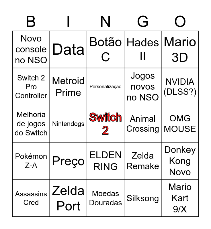 This bingo card has a free space and 24 words: Preço, Zelda Port, Personalização, Assassins Cred, Mario 3D, Novo console no NSO, Switch 2 Pro Controller, Data, Animal Crossing, ELDEN RING, Jogos novos no NSO, Melhoria de jogos do Switch, Zelda Remake, Donkey Kong Novo, Metroid Prime, Silksong, OMG MOUSE, Botão C, NVIDIA (DLSS?), Nintendogs, Mario Kart 9/X, Pokémon Z-A, Hades II and Moedas Douradas.