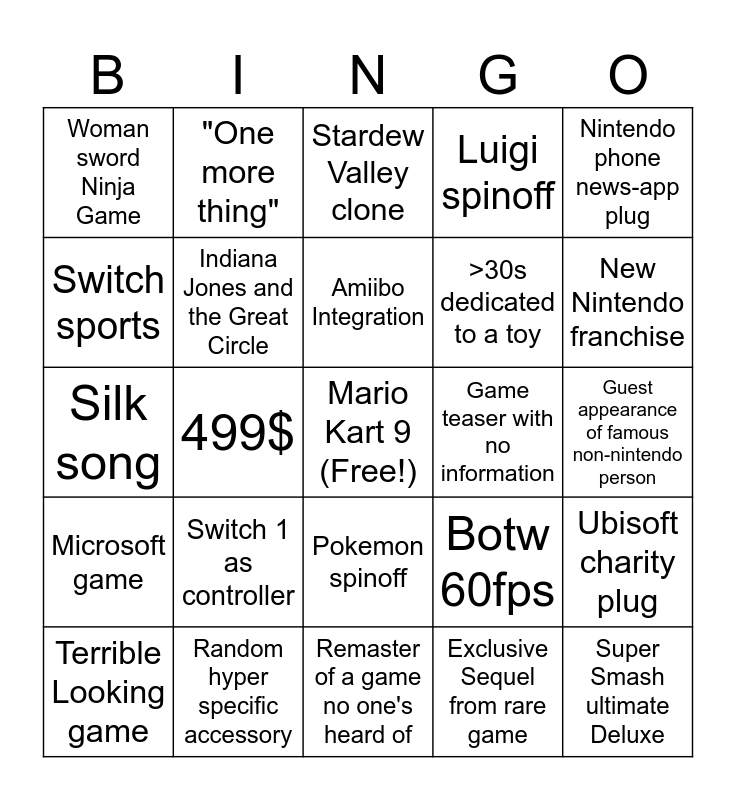 This bingo card has a free space and 24 words: Switch 1 as controller, Random hyper specific accessory, Amiibo Integration, Terrible Looking game, Nintendo phone news-app plug, Woman sword Ninja Game, Switch sports, "One more thing", Game teaser with no information, Pokemon spinoff, >30s dedicated to a toy, Silk song, Botw 60fps, Ubisoft charity plug, Indiana Jones and the Great Circle, Exclusive Sequel from rare game, Guest appearance of famous non-nintendo person, Stardew Valley clone, New Nintendo franchise, 499$, Super Smash ultimate Deluxe, Microsoft game, Luigi spinoff and Remaster of a game no one's heard of.