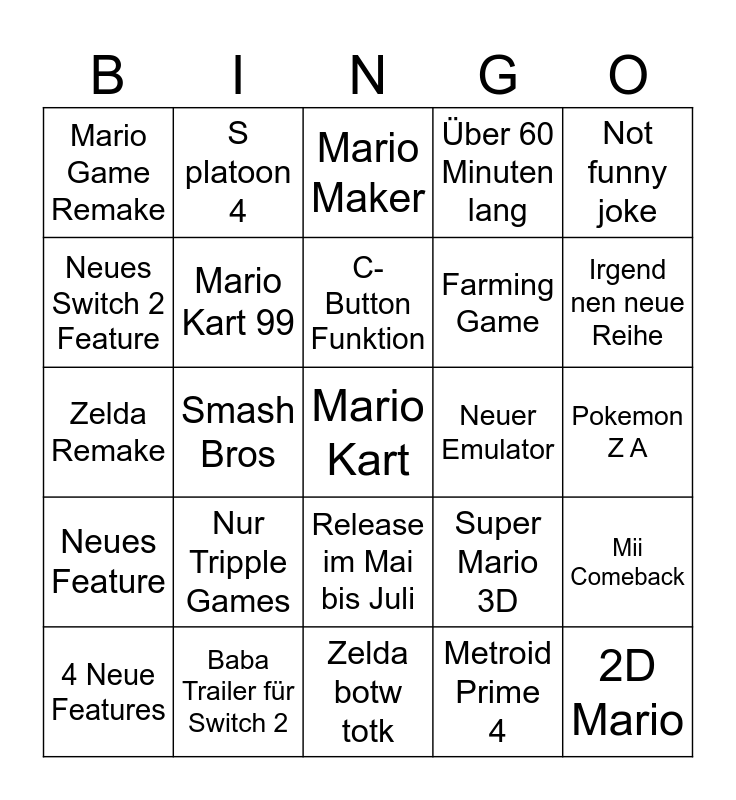 This bingo card has a free space and 24 words: Nur Tripple Games, Baba Trailer für Switch 2, C-Button Funktion, 4 Neue Features, Not funny joke, Mario Game Remake, Neues Switch 2 Feature, S platoon 4, Neuer Emulator, Release im Mai bis Juli, Farming Game, Zelda Remake, Super Mario 3D, Mii Comeback, Mario Kart 99, Metroid Prime 4, Pokemon Z A, Mario Maker, Irgend nen neue Reihe, Smash Bros, 2D Mario, Neues Feature, Über 60 Minuten lang and Zelda botw totk.