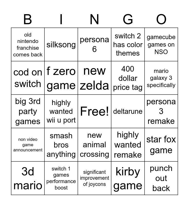 This bingo card has a free space and 24 words: smash bros anything, switch 1 games performance boost, new zelda, 3d mario, gamecube games on NSO, old nintendo franchise comes back, cod on switch, silksong, deltarune, new animal crossing, 400 dollar price tag, big 3rd party games, highly wanted remake, star fox game, f zero game, kirby game, persona 3 remake, persona 6, mario galaxy 3 specifically, highly wanted wii u port, punch out back, non video game announcement, switch 2 has color themes and significant improvement of joycons.