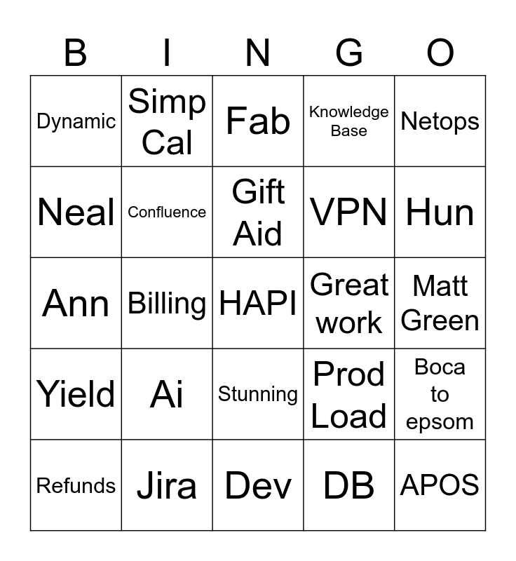 This bingo card has 50 words: Product, HAPI, API, Dev, Ai, Snap, Simp Cal, POS, Neal, UD, Confluence, Knowledge Base, Boca to epsom, Prod Load, Merlin, Little Lion, Gift Aid, Great work, UAT, Netops, Billing, DB, Dynamic, VPN, Wizard, APOS, Hun, Honestly, Fab, Stunning, XML Request & Response, acesso, Reach out, On Call, Jira, Jamo, Tricky Dicky, Central, Bernardo, Matt Green, Session ID, Debug, Exchange, Test Order, Refunds, Ann, LLB, Cluster, Yield and EMEA.