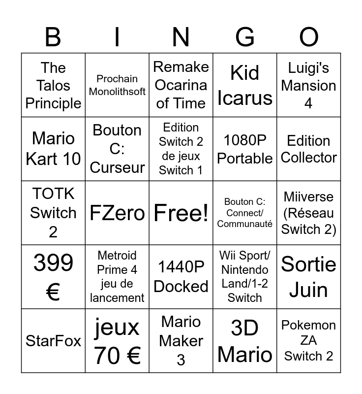 This bingo card has a free space and 24 words: Metroid Prime 4 jeu de lancement, jeux 70 €, Edition Switch 2 de jeux Switch 1, StarFox, Luigi's Mansion 4, The Talos Principle, Mario Kart 10, Prochain Monolithsoft, Bouton C: Connect/ Communauté, 1440P Docked, 1080P Portable, TOTK Switch 2, Wii Sport/ Nintendo Land/1-2 Switch, Sortie Juin, Bouton C: Curseur, 3D Mario, Miiverse (Réseau Switch 2), Remake Ocarina of Time, Edition Collector, FZero, Pokemon ZA Switch 2, 399 €, Kid Icarus and Mario Maker 3.