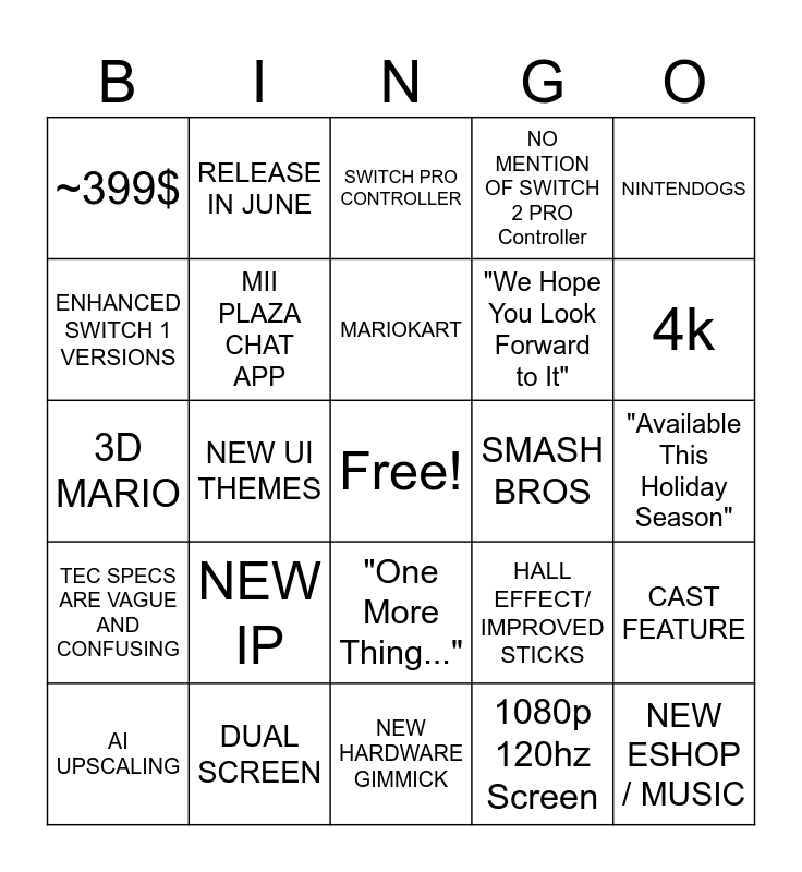 This bingo card has a free space and 24 words: AI UPSCALING, NEW IP, MARIOKART, 1080p 120hz Screen, NINTENDOGS, ~399$, RELEASE IN JUNE, SWITCH PRO CONTROLLER, SMASH BROS, "Available This Holiday Season", 3D MARIO, MII PLAZA CHAT APP, HALL EFFECT/ IMPROVED STICKS, CAST FEATURE, ENHANCED SWITCH 1 VERSIONS, DUAL SCREEN, NEW HARDWARE GIMMICK, NO MENTION OF SWITCH 2 PRO Controller, 4k, TEC SPECS ARE VAGUE AND CONFUSING, NEW UI THEMES, "One More Thing...", "We Hope You Look Forward to It" and NEW ESHOP / MUSIC.