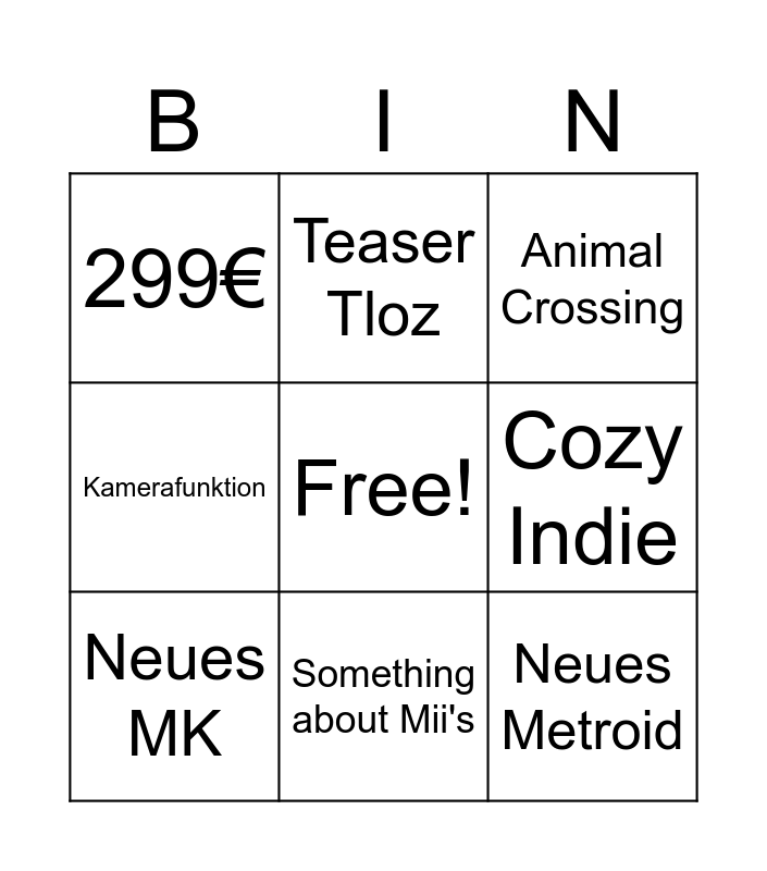 This bingo card has a free space and 8 words: Cozy Indie, Animal Crossing, Teaser Tloz, Neues MK, 299€, Neues Metroid, Kamerafunktion and Something about Mii's.