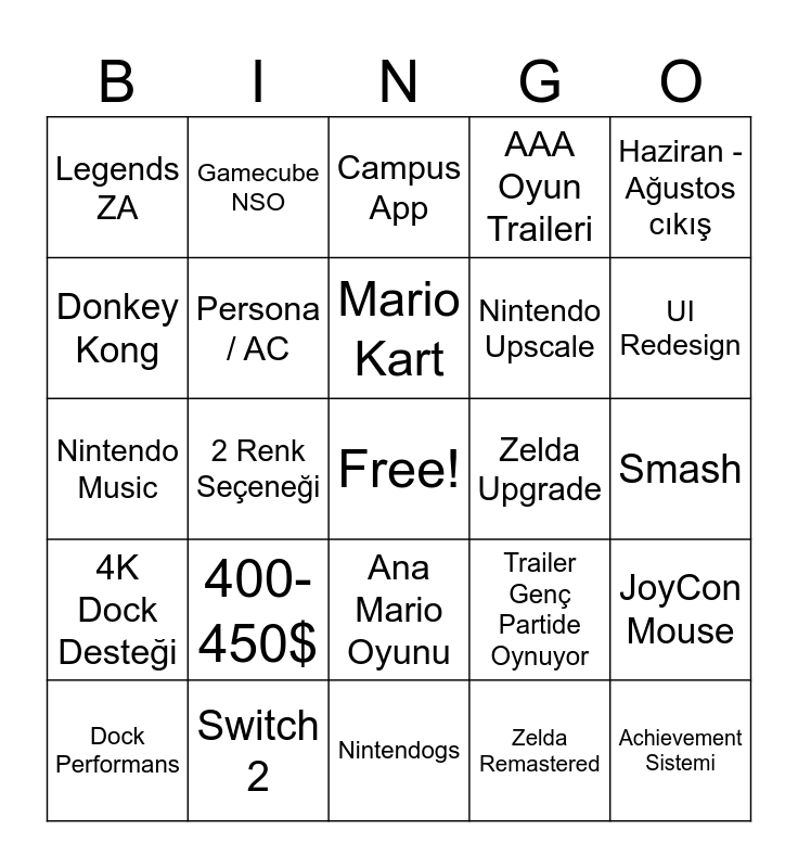 This bingo card has a free space and 24 words: 400-450$, Switch 2, Mario Kart, Dock Performans, Haziran - Ağustos cıkış, Legends ZA, Donkey Kong, Gamecube NSO, Zelda Upgrade, Ana Mario Oyunu, Nintendo Upscale, Nintendo Music, Trailer Genç Partide Oynuyor, JoyCon Mouse, Persona / AC, Zelda Remastered, Smash, Campus App, UI Redesign, 2 Renk Seçeneği, Achievement Sistemi, 4K Dock Desteği, AAA Oyun Traileri and Nintendogs.