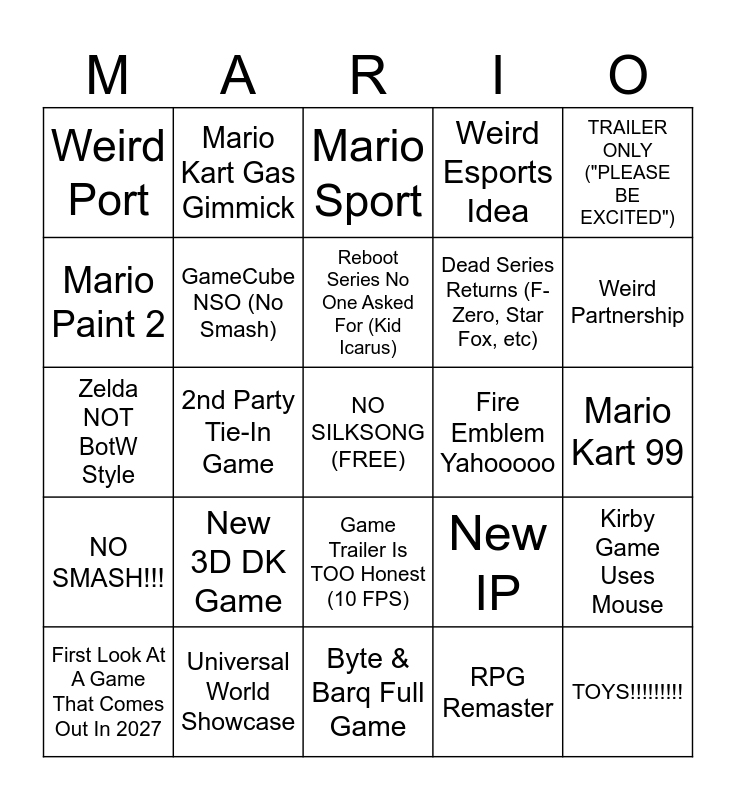 This bingo card has a free space and 24 words: New 3D DK Game, Universal World Showcase, Reboot Series No One Asked For (Kid Icarus), First Look At A Game That Comes Out In 2027, TRAILER ONLY ("PLEASE BE EXCITED"), Weird Port, Mario Paint 2, Mario Kart Gas Gimmick, Fire Emblem Yahooooo, Game Trailer Is TOO Honest (10 FPS), Dead Series Returns (F-Zero, Star Fox, etc), Zelda NOT BotW Style, New IP, Kirby Game Uses Mouse, GameCube NSO (No Smash), RPG Remaster, Mario Kart 99, Mario Sport, Weird Partnership, 2nd Party Tie-In Game, TOYS!!!!!!!!!, NO SMASH!!!, Weird Esports Idea and Byte & Barq Full Game.