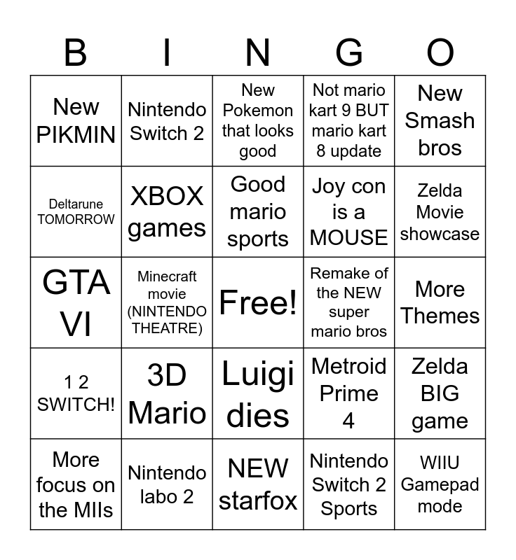 This bingo card has a free space and 24 words: 3D Mario, Nintendo labo 2, Good mario sports, More focus on the MIIs, New Smash bros, New PIKMIN, Deltarune TOMORROW, Nintendo Switch 2, Remake of the NEW super mario bros, Luigi dies, Joy con is a MOUSE, GTA VI, Metroid Prime 4, Zelda BIG game, XBOX games, Nintendo Switch 2 Sports, More Themes, New Pokemon that looks good, Zelda Movie showcase, Minecraft movie (NINTENDO THEATRE), WIIU Gamepad mode, 1 2 SWITCH!, Not mario kart 9 BUT mario kart 8 update and NEW starfox.