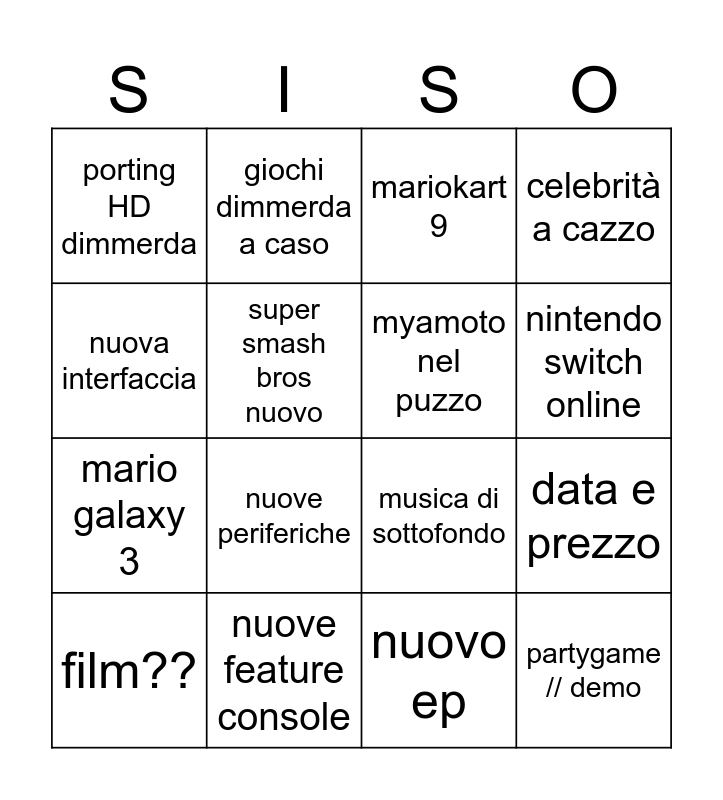 This bingo card has 16 words: nuove feature console, data e prezzo, mariokart 9, porting HD dimmerda, mario galaxy 3, giochi dimmerda a caso, musica di sottofondo, nuovo ep, nuova interfaccia, super smash bros nuovo, film??, celebrità a cazzo, nuove periferiche, nintendo switch online, myamoto nel puzzo and partygame // demo.
