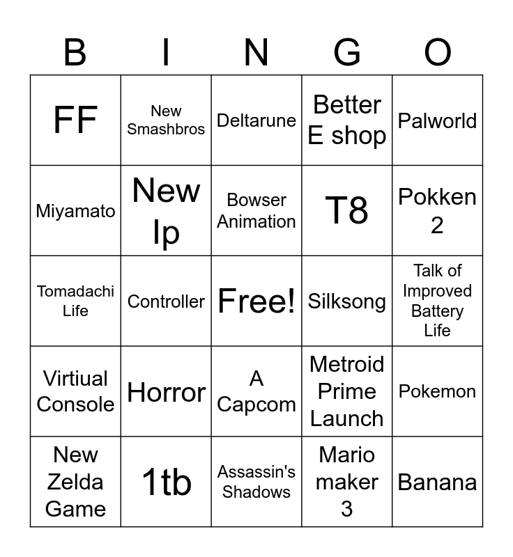 This bingo card has a free space and 24 words: Horror, 1tb, Bowser Animation, New Zelda Game, Palworld, FF, Miyamato, New Smashbros, Silksong, A Capcom, T8, Tomadachi Life, Metroid Prime Launch, Pokemon, New Ip, Mario maker 3, Talk of Improved Battery Life, Deltarune, Pokken 2, Controller, Banana, Virtiual Console, Better E shop and Assassin's Shadows.