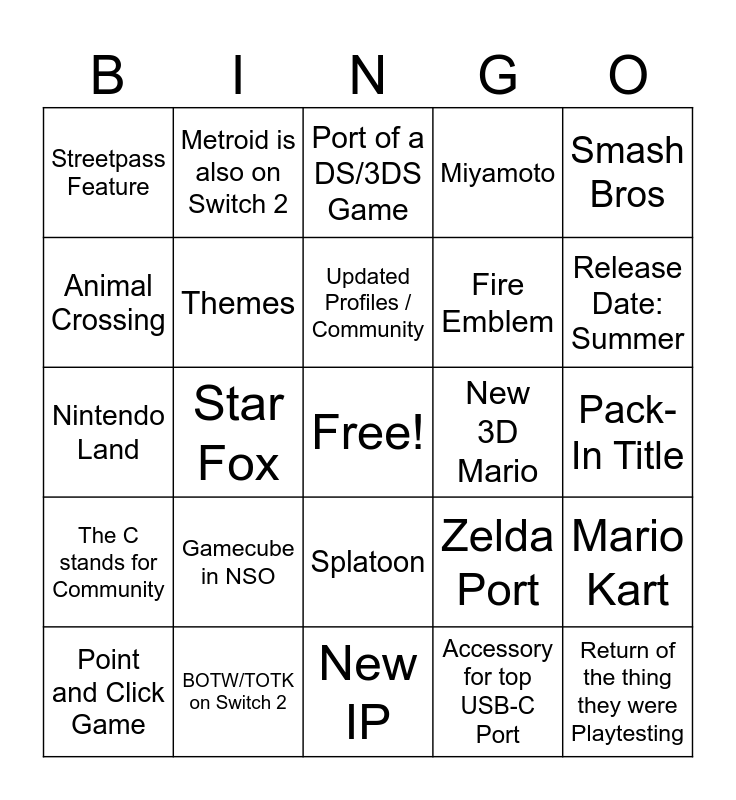 This bingo card has a free space and 27 words: Zelda Port, Kid Icarus, Fire Emblem, New IP, Animal Crossing, Port of a DS/3DS Game, Metroid is also on Switch 2, The C stands for Community, New 3D Mario, Mario Kart, Nintendo Land, Miyamoto, Point and Click Game, BOTW/TOTK on Switch 2, Release Date: Summer, Price: $375 - 425, Themes, Updated Profiles / Community, Gamecube in NSO, Streetpass Feature, Pack-In Title, Accessory for top USB-C Port, Star Fox, Return of the thing they were Playtesting, Splatoon, Smash Bros and Kirby.