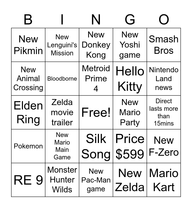 This bingo card has a free space and 24 words: New Mario Main Game, Monster Hunter Wilds, Metroid Prime 4, RE 9, Smash Bros, New Pikmin, New Animal Crossing, New Lenguini's Mission, New Mario Party, Silk Song, Hello Kitty, Elden Ring, Price $599, New F-Zero, Bloodborne, New Zelda, Direct lasts more than 15mins, New Donkey Kong, Nintendo Land news, Zelda movie trailer, Mario Kart, Pokemon, New Yoshi game and New Pac-Man game.
