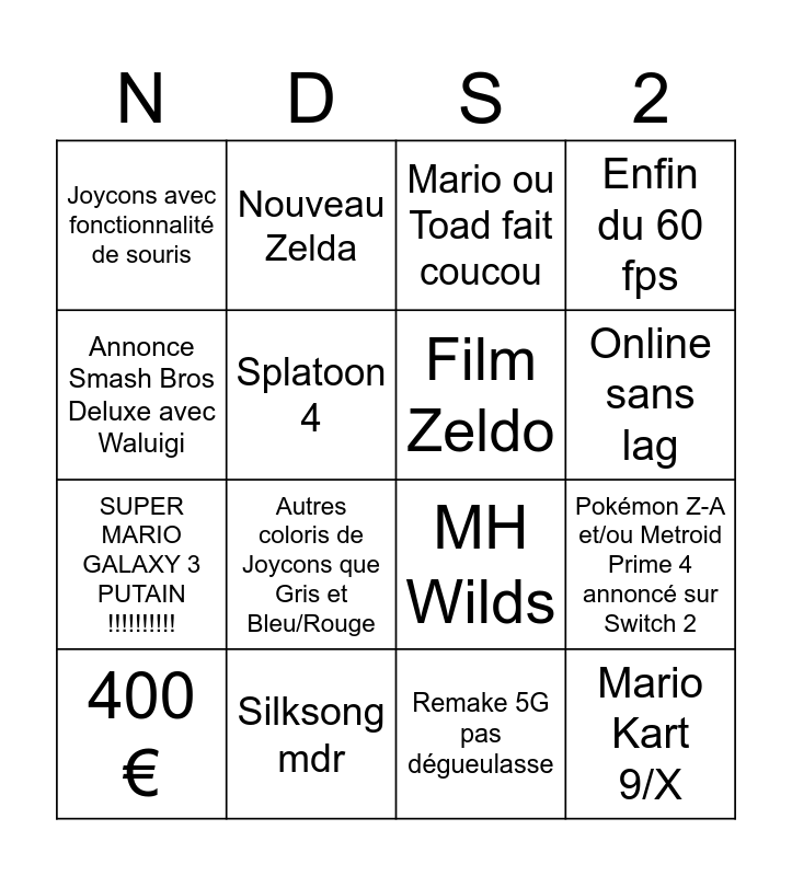 This bingo card has 16 words: Silksong mdr, Pokémon Z-A et/ou Metroid Prime 4 annoncé sur Switch 2, Mario ou Toad fait coucou, Joycons avec fonctionnalité de souris, SUPER MARIO GALAXY 3 PUTAIN !!!!!!!!!!, Nouveau Zelda, MH Wilds, Remake 5G pas dégueulasse, Annonce Smash Bros Deluxe avec Waluigi, Splatoon 4, 400 €, Enfin du 60 fps, Autres coloris de Joycons que Gris et Bleu/Rouge, Online sans lag, Film Zeldo and Mario Kart 9/X.