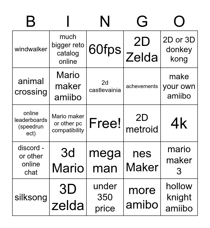 This bingo card has a free space and 24 words: 3d Mario, 3D zelda, 2d castlevainia, silksong, 2D or 3D donkey kong, windwalker, animal crossing, much bigger reto catalog online, 2D metroid, mega man, achevements, online leaderboards (speedrun ect), nes Maker, mario maker 3, Mario maker amiibo, more amibo, 4k, 60fps, make your own amiibo, Mario maker or other pc compatibility, hollow knight amiibo, discord - or other online chat, 2D Zelda and under 350 price.