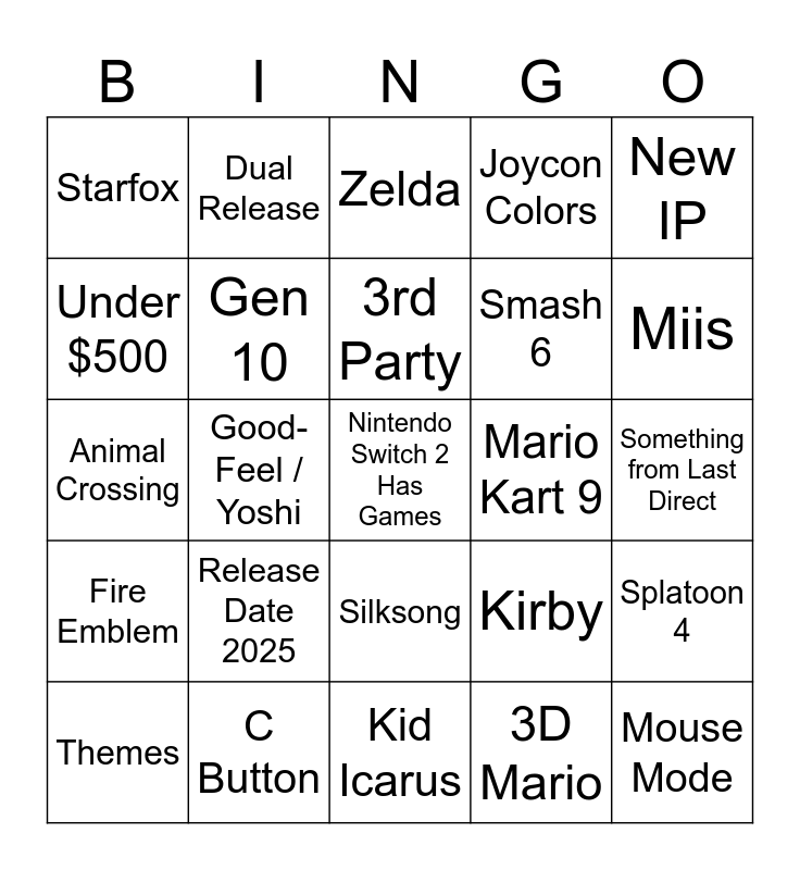 This bingo card has a free space and 24 words: Release Date 2025, C Button, 3rd Party, Themes, New IP, Starfox, Under $500, Dual Release, Mario Kart 9, Silksong, Smash 6, Animal Crossing, Kirby, Splatoon 4, Gen 10, 3D Mario, Something from Last Direct, Zelda, Miis, Good-Feel / Yoshi, Mouse Mode, Fire Emblem, Joycon Colors and Kid Icarus.